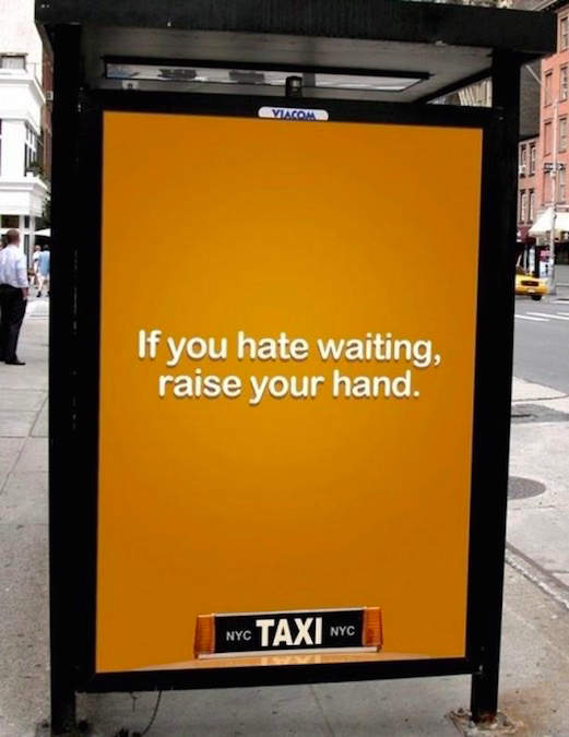 簡簡單單一(yī)句話(huà),貼在公交車站(zhàn),告訴那些(xiē)等公交等得不耐煩的人(rén),隻要招手,就(jiù)會有一(yī)輛TAXI把你接走。